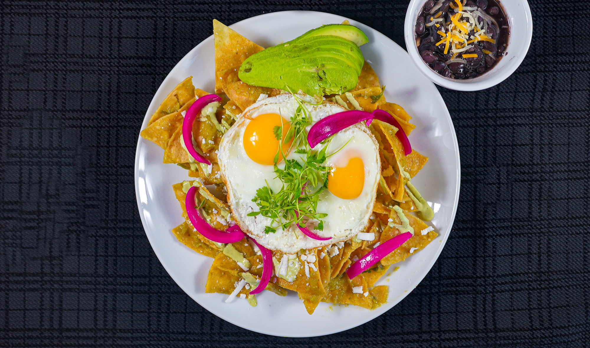 2 Eggs any style, crispy tortilla chips, salsa verde, queso freso, creamy cilantro sauce, pickled onions, avocado, cilantro, radish, side of black beans
